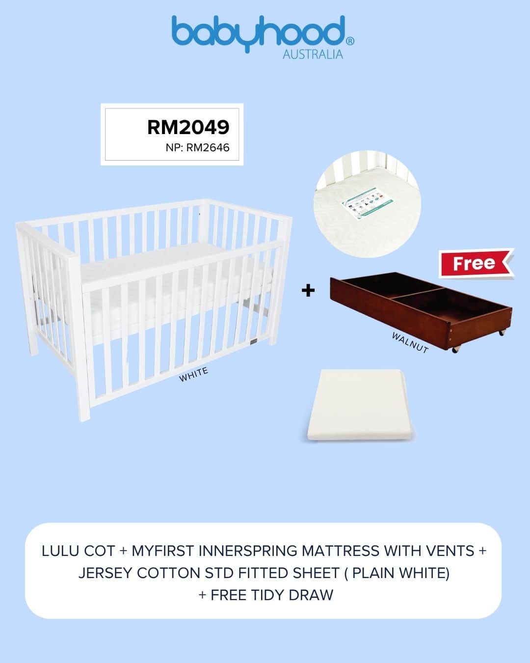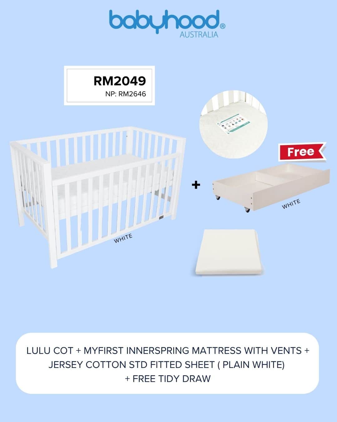 | Colour | Beech, White (cot only), White + My First Innerspring Mattress (Vents) + Jersey Cotton Fitted Sheet Plain White + Tidy Draw Walnut, White + My First Innerspring Mattress (Vents) + Jersey Cotton Fitted Sheet Plain White + Tidy Draw White |